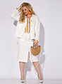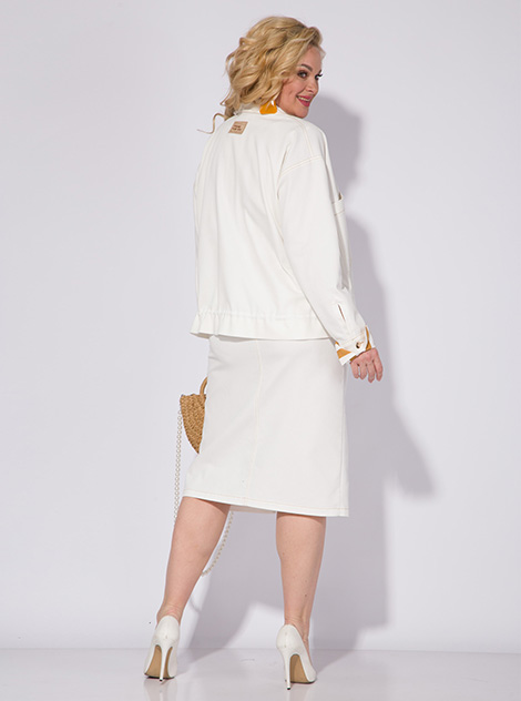 Стильный джинсовый юбочный костюм 3-ка, состоящий из жакета силуэта оверсайз, юбки и топа. Юбка и жакет выполнены из «Джинса». Жакет со спущенной линией плеча, длинным рукавом на притачной манжете. Воротник в модели отложной, с центральной застежкой на петли и пуговицы. Жакет с кулисой на утяжку с регуляторами по бокам (при желании), для приталевания изделия. Спинка с отрезной кокеткой и декоративным шевроном-нашивкой. Юбка прямого покроя, с застежкой на молнию и обработанным гульфиком. Спереди расположены карманы и разрез для свободы движения. Пояс притачной с резинкой на боковых участках пояса. Декоративный элемент в виде платка из отделочной ткани на съёмном карбине. В комплект входит топ. Топ с округлым вырезом горловины без рукавов. Изюминкой данной модели служат съемные манжеты из отделочной ткани с застежкой на пуговки! Стильный, оригинальный костюм и в пир и в мир! Все элементы данного костюма можно комбинировать с изделиями из Вашего гардероба! Жакет – 60 см. Рукав жакета – 60 см. Юбка – 70 см. Топ – 60 см