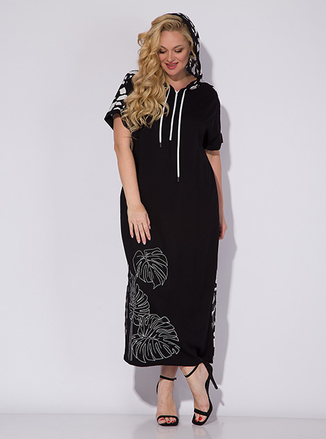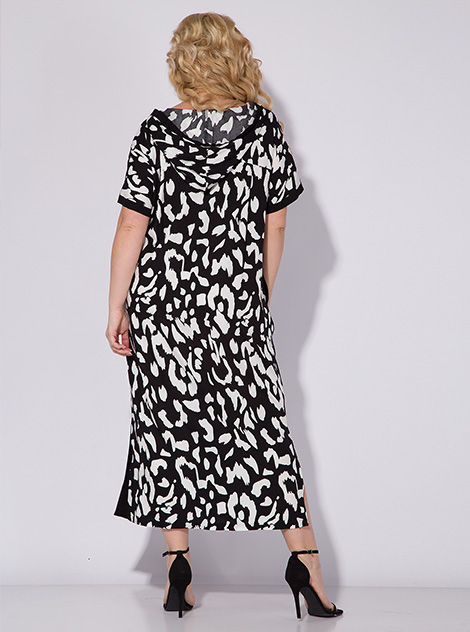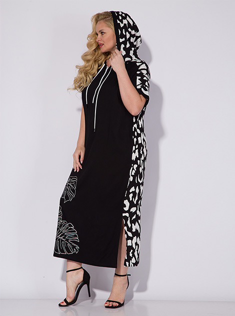 Эффектное платье в стиле спорт-шик выполнено с сочетанием штапельной ткани! Модель свободного силуэта, со спущенной линией плеча и цельнокроеным рукавом на небольшой манжете. Горловина оформлена мягким свободным капюшоном, переходящим в застежку-молнию. По низу полочки расположена печать-накат. Спинка на кокетке. По бокам изделия расположены карманы и разрезы на свободу движения! Капюшон регулируется на кулиску с декоративной шнуровкой. Платье женское идеально для жаркого лета, простой крой, не сковывающий движения. Платье сочетает в себе комбинацию контрастных цветов, а дизайнерская печать по детали переда добавляет яркий акцент. Длина по спинке – 125 см. Рукав – около 30 см (спущенный)