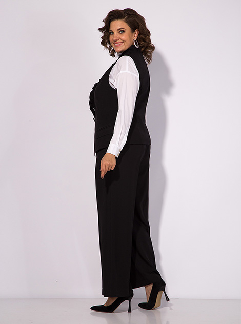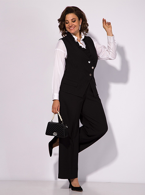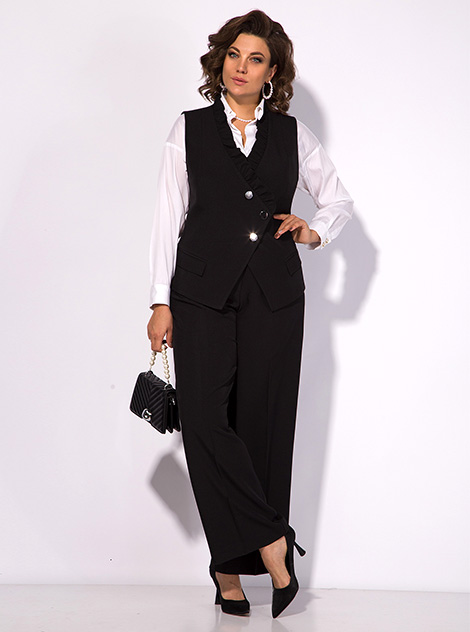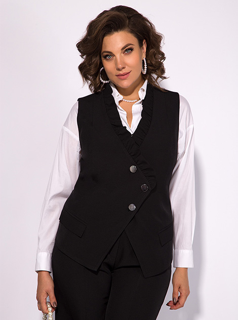 Эффектный офисный костюм, состоящий из брюк и жилетки. Оригинальная жилетка на шелковой подкладке, с ассиметричной застежкой на пуговицы. Вырез горловины v-образной формы с рюшей из основной ткани. Жилетка с прорезными карманами с клапаном. Спинка приталенная. Брюки прямого кроя, на притачном поясе. Застежка - брючная тесьма-молния с обработанным гульфиком. В боковых участках пояса вставлена резинка для более комфортного прилегания. В брюках заутюжены канты. Такой костюм можно носить в комплекте или раздельно, дополнить блузкой для деловой встречи или футболкой для модной вечеринки. В таком костюме вы всегда будете чувствовать себя превосходно! Длина жилетки – 60 см. Брюк – 104 см