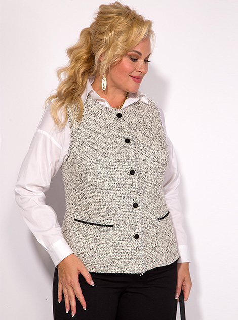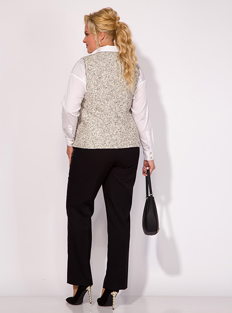 Элегантный и стильный комплект, состоящий из твидовой жилетки и прямых классических брюк! Жилетка из твида в стиле CHANEL, с центральной бортовой застежкой на петли и пуговицы. По полочке расположены накладные карманы, украшены декоративной тесьмой. Вырез горловины и проймы украшен бахромой из основной ткани. Жилетка на шелковой подкладке. В комплект входят прямые классические брюки, с завышенной посадкой на притачном поясе. В боковых участках пояса вставлена резинка для более комфортного прилегания. В брюках имеются боковые карманы, заутюжены канты. Отличный вариант как в офис, на работу, для особо случая! Длина жилетки – 60 см, брюк – 104 см