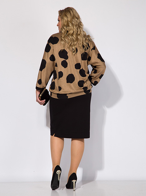 Экстравагантный и стильный юбочный костюм, в модной цветовой гамме, выполнен из туники с оригинальным принтом и классической трикотажной юбки. Туника свободного силуэта, со спущенной линией плеча. Комфортный свободный рукав обработан декоративным манжетам. По линии полочки продольные членения, переходящие в накладной карман. Горловина округлой формы, на мягкой комфортной планке. По низу изделия предусмотрена планка-манжет из основной ткани. В костюм входит классическая трикотажная юбка, на стрейчевой подкладке, на притачном поясе с круговой резинкой. По низу юбки предусмотрены небольшие разрезы на свободу движения. Если Вы ищете идеальное сочетание стиля и комфорта, эта модель Ваш идеальный выбор! Длина юбки – 60-62 см. Длина туники – 65 см. +напуск. Длина рукава – ориентировочно – 50 см