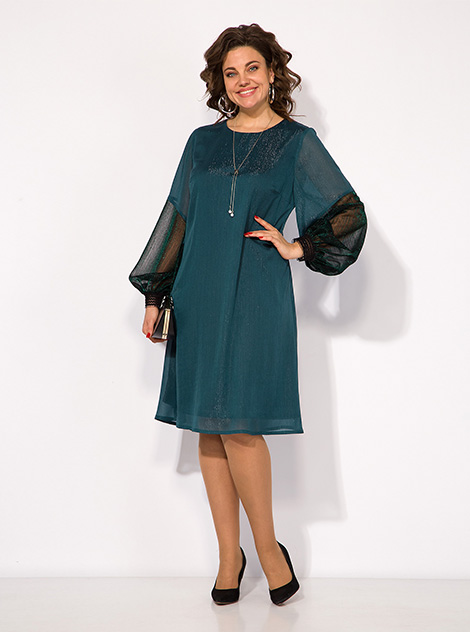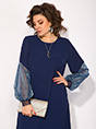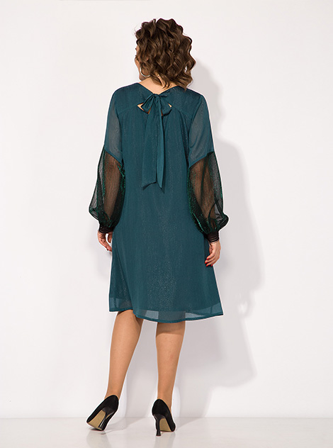 Элегантное, нарядное платье. Платье трапециевидного силуэта от линии груди. Вырез горловины округлый. Эффектный пышный рукав украшает вставка из сетки. Рукав по низу присборен на декоративную резинку. Изюминкой данной модели служит эффектный вырез по спинке, переходящий в бант-завязку! Платье на стрейчевой трикотажной подкладке. Платье идеально подходит на любой тип фигуры. Длина - 102 см, рукав – 63 см