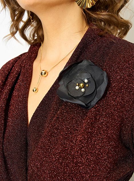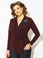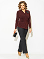 Эффектная нарядная блузка, выполнена из мягкого трикотажа с мерцающим эффектом. Такой дизайн ткани придает необычное переплетение нитей: с изнанки мягкий однотонный трикотаж! Вырез горловины мягкая стойка, переходящая в V-образный вырез с имитацией запаха. По полочке заложены декоративные складки для комфортного прилегания изделия. Низ блузки ассиметричный. Пояс декорирован задрапированным поясом из основной ткани, что зрительно стройнит и скрывает все недостатки фигуры. Рукав втачной, длинный. Спинка приталенная, без особенностей. В комплект входит съёмная брошь. ВНИМАНИЕ! Брошь может отличаться от фото! Длина по спинке – 63 см, рукав – 62 см. По переду – 74 см
