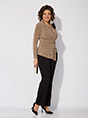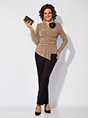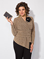 Эффектная нарядная блузка, выполнена из мягкого трикотажа с мерцающим эффектом. Такой дизайн ткани придает необычное переплетение нитей: с изнанки мягкий однотонный трикотаж! Вырез горловины мягкая стойка, переходящая в V-образный вырез с имитацией запаха. По полочке заложены декоративные складки для комфортного прилегания изделия. Низ блузки ассиметричный. Пояс декорирован задрапированным поясом из основной ткани, что зрительно стройнит и скрывает все недостатки фигуры. Рукав втачной, длинный. Спинка приталенная, без особенностей. В комплект входит съёмная брошь. ВНИМАНИЕ! Брошь может отличаться от фото! Длина по спинке – 63 см, рукав – 62 см. По переду – 74 см