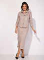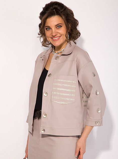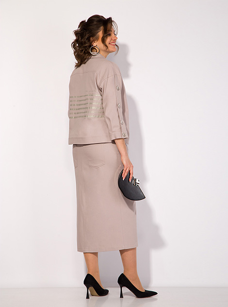 Представляем Вам стильный женский костюм из хлопкового денима (джинса), состоящий из зауженной юбки и свободного жакета! Жакет свободного силуэта, выполнен из хлопка под джинс. Воротник отложной; застежка центральная на петли и пуговицы. Рукав со спущенным плечевым поясом, длиной ¾-ти на притачной манжете. По центру рукава расположена декоративная застежка на петли и пуговицы. Перед с кокеткой, с ассиметричным накладным карманом. Спинка повторяет дизайн полочки. По спинке расположена ассиметричная печать в виде полоски! В комплекте юбка-карандаш, зауженная к низу, длиной за колено. Модель с пикантным разрезом по переду. Застежка на металлическую молнию с обработанным гульфиком. Пояс притачной, в боковых участках вставлена резинка. По спинке расположены накладные карманы. Юбка без подкладки выполнена из джинсовой ткани. Модель подойдет для любой женщины в любом возрасте и размере. Длина жакета – 60 см, рукав – 50 см. Длина юбки – 80 см