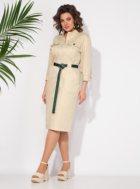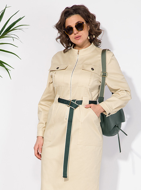 Стильное и эффектное платье, в стиле - сафари! Модель выполнена из хлопкового джинса! Платье полуприталенного силуэта, длиной за колено. По талии отрезное. Воротник - небольшая стойка, переходящая в застежку на металлическую молнию. Рукав рубашечный, полной длины. По низу рукава предусмотрен манжет с застежкой на пуговку. По полочке расположены накладные карманы с клапаном. В платье также предусмотрены накладные карманы. По спинке кокетка с центральным швом переходящий в разрез на свободу движения. В платье предусмотрен съёмный пояс с металлической пряжкой! Длина – 110 см, рукав – 62 см