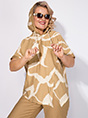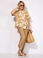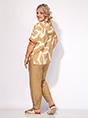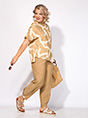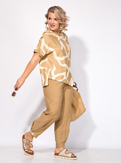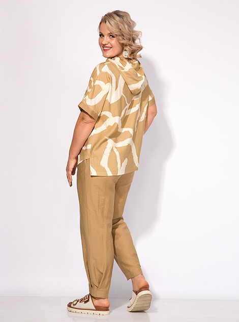 Стильный летний костюм, состоящий из удлиненной туники свободного покроя и брюк. Оригинальная туника из вискозы добавлением льна. Модель с цельнокроеным укороченным рукавом и ассиметричным подрезом по полочке. Модель с легким капюшоном и кулисой на шнуровке. Низ изделия разноуровневый. Спинка цельная. В комплекте свободные брючки, завышенной посадки. Брюки на притачном поясе с круговой резинкой. Имеются боковые карманы. Низ с заложенными складками, что придает изделию более спортивный образ. Длина туники по спинке - 68 см, рукав – около 30 см. Брюки – 100 см