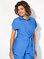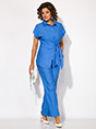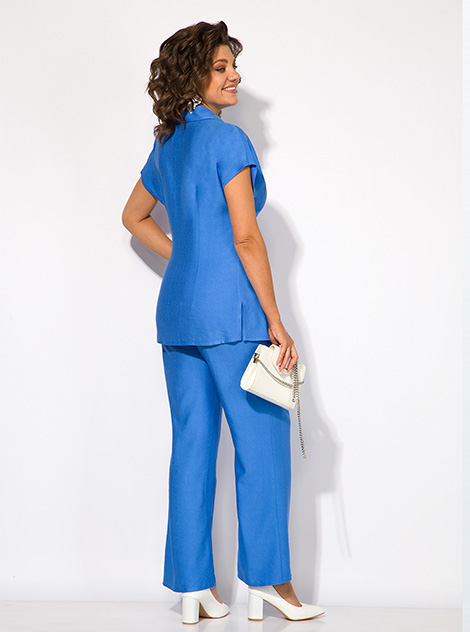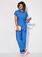 Эффектный летний костюм, выполнен из текстильной ткани на основе вискозы. Модель состоит из блузки и прямых свободных брюк. Блузка полуприталенного силуэта с цельнокроеным спущенным рукавом. Воротник отложной, рубашечного типа. Застежка – центральная, на планке, на петли и пуговицы. По бокам предусмотрены разрезы. Спинка с Талиевыми выточками. Изюминка данной модели – эффектная мягкая ассиметричная завязка на бант. Брюки в комплекте с завышенной посадкой, на притаточном поясе с резинкой. В брюках имеются боковые карманы. Длина блузки – 70 см. рукав – около 15 см. Брюки – 104-106 см