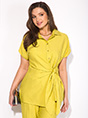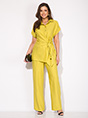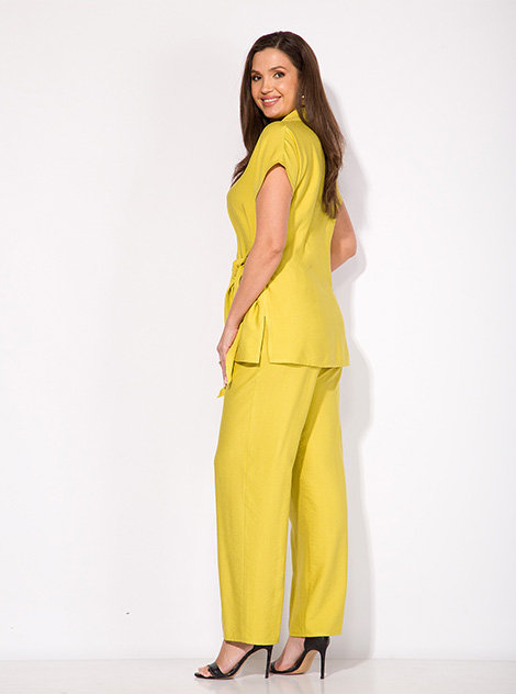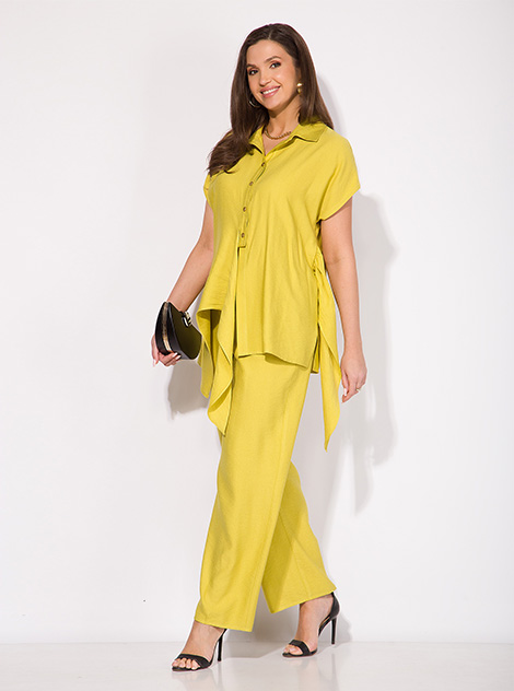 Эффектный летний костюм, выполнен из текстильной ткани на основе вискозы. Модель состоит из блузки и прямых свободных брюк. Блузка полуприталенного силуэта с цельнокроеным спущенным рукавом. Воротник отложной, рубашечного типа. Застежка – центральная, на планке, на петли и пуговицы. По бокам предусмотрены разрезы. Спинка с Талиевыми выточками. Изюминка данной модели – эффектная мягкая ассиметричная завязка на бант. Брюки в комплекте с завышенной посадкой, на притаточном поясе с резинкой. В брюках имеются боковые карманы. Длина блузки – 70 см. рукав – около 15 см. Брюки – 104-106 см