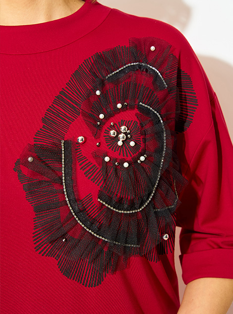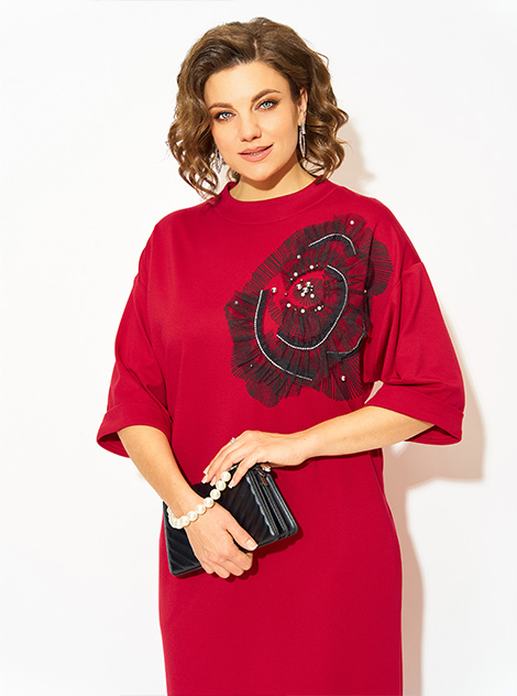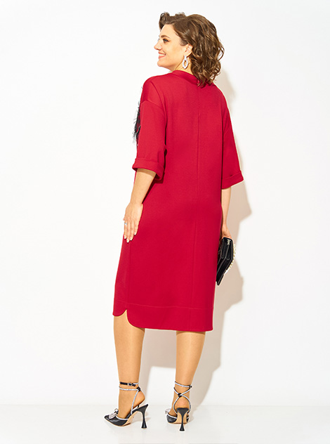 Очень лаконичное и стильное платье определённо привлечёт к себе внимание окружающих. Модель свободного «о»-образного силуэта. Левую часть плеча и груди украшает изысканная печать аппликация в виде цветка с декором из бусин и жемчуга. Платье с мягко лежащей стойкой у горловины. Рукав длиной ¾-ти, на притачной манжете на отворот. Модель слегка заужена к низу, с разно уровневым фигурным низом, оформленный обтачкой. В платье предусмотрены карманы. Универсальность и неподвластный времени стиль этой модели позволяют создавать множество образов, дополняя его разнообразными аксессуарами. Оно идеально сочетает в себе комфорт, элегантность и актуальные модные тенденции. Длина по спинке – 106 см, рукав – 45-50 см