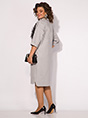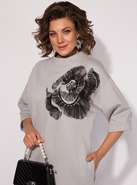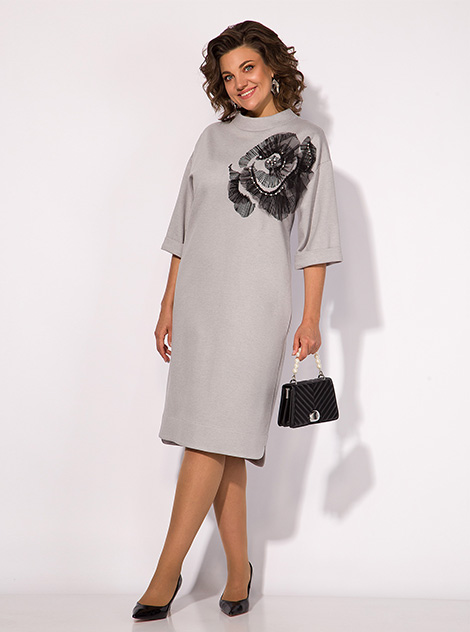 Очень лаконичное и стильное платье определённо привлечёт к себе внимание окружающих. Модель свободного «о»-образного силуэта. Левую часть плеча и груди украшает изысканная печать аппликация в виде цветка с декором из бусин и жемчуга. Платье с мягко лежащей стойкой у горловины. Рукав длиной ¾-ти, на притачной манжете на отворот. Модель слегка заужена к низу, с разно уровневым фигурным низом, оформленный обтачкой. В платье предусмотрены карманы. Универсальность и неподвластный времени стиль этой модели позволяют создавать множество образов, дополняя его разнообразными аксессуарами. Оно идеально сочетает в себе комфорт, элегантность и актуальные модные тенденции. Длина по спинке – 106 см, рукав – 45-50 см