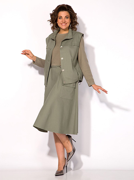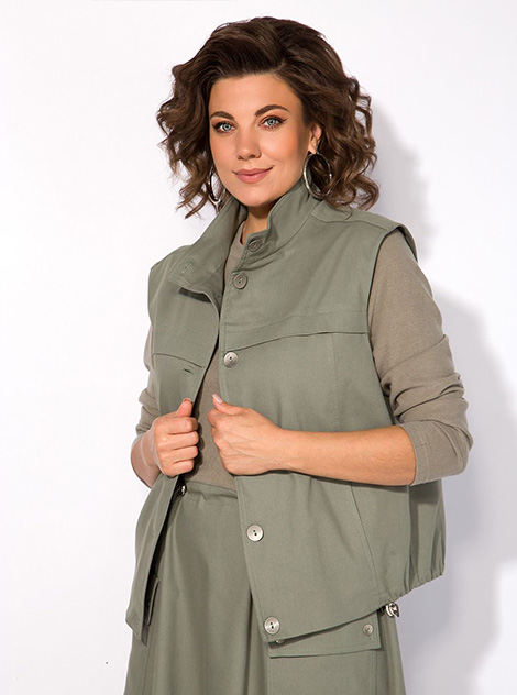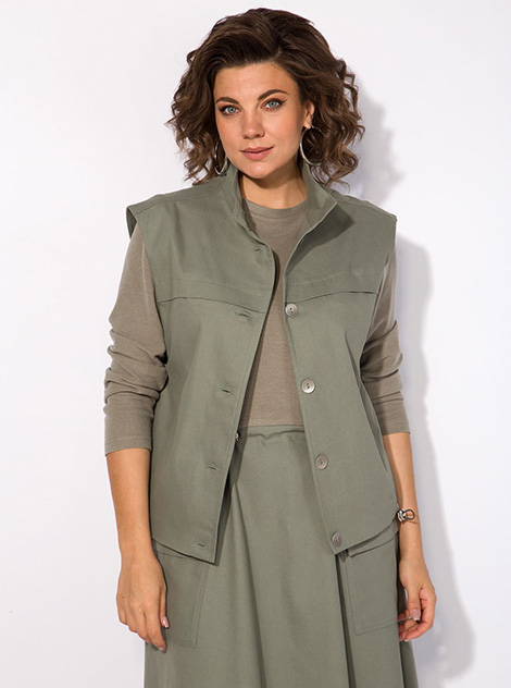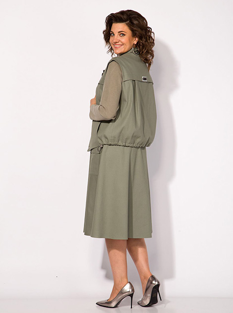 Комплект женский, 2-ух предметный, состоящий из платья и модного жилета в стиле СASUAL. Комбинированное платье, полуприталенного силуэта, выполнено из сочетания мягкого трикотажа и хлопкового джинса. Платье с вточным рукавом полной длины и округлой мягкой горловиной. По талии предусмотрена кулиска с утяжкой. Платье с разклёшенной юбкой и накладными карманами. В комплект входит жилетка свободного силуэта, центральной бортовой застежкой на петли и пуговицы с воротником стойкой. Модель с декоративными кокетками по полочке и спинке. По переду расположены карманы в рельефных швах. Низ изделия присборивается на кулису с регуляторами. Жилетка на шелковой подкладке. Длина жилетки – 65 см, платье – 115 см, рукав – 63 см