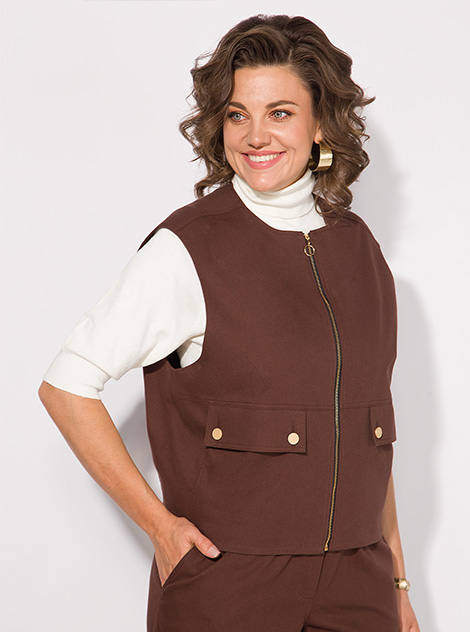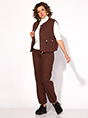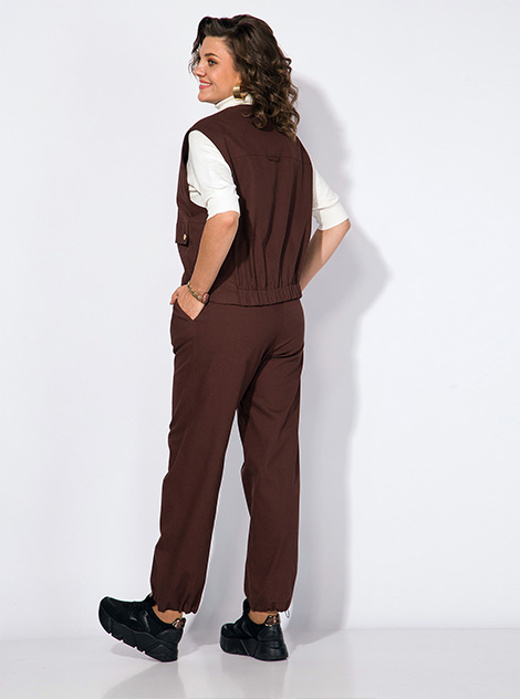 Стильный костюм 2-ка, состоящий из джинсовой жилетки и брюк. Жилетка свободного силуэта, с округлым вырезом горловины. Застежка центральная, на металлическую молнию. По полочке расположены рабочие карманы с клапаном. Спинка на декоративной кокетке, по низу предусмотрена резинка для комфортного прилегания. Жилетка на шелковой подкладке. Брюки в комплекте прямые, присбориваются по низу на кулиску. Брюки на притачном поясе с круговой резинкой и боковыми карманами. Модный в этом сезоне оттенок комплекта – горький шоколад, не оставит Вас без внимания окружающих. Этот стильный, трендовый и модный костюм станет незаменимым элементом вашего гардероба Длина жилетки – 55 см, брюк – 100 см