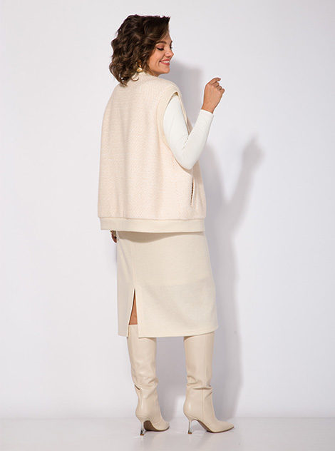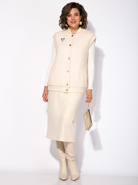 Подарите себе комфорт и элегантность с нашим женским трикотажным костюмом, состоящим из удлиненного жилета на пуговицах и юбки длиной за колено. Жилет выполнен из смесовой ткани: шерсти и акрила, с прорезными карманами на подкладке, что добавляет комфорт в прохладные дни. Линия плеча жилета слегка спущена; низ горловины и изделия оформлен мягкой манжетой из трикотажа. Юбка выполнена из качественного трикотажа; модель заужена к низу, на притачном поясе с круговой резинкой. Юбка на трикотажной подкладке, со шлицей для свободы движения расположенной по среднему шву спинки. Высококачественный мягкий трикотаж обеспечивает долговечность и приятные тактильные ощущения. Создайте неповторимый модный лук с женским трикотажным костюмом. Длина жилета – 68 см. Юбка – 80 см. ВНИМАНИЕ! Брошь входит в комплектацию, может отличаться от фото!