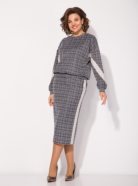 Неповторимый стиль и удивительный комфорт умело сочетаются в этом женском трикотажном костюме с юбкой. Приталенный силуэт юбки с высокой посадкой, а также свободный крой свитшота сделает образ лаконичным, поможет всегда оставаться в тренде. Продольные лампасы по рукаву и юбке из однотонной ткани зрительно стройнят и вытягивают силуэт. Юбка на питачном поясе с круговой резинкой имеет боковые карманы. Сзади предусмотрен разрез по среднему полотнищу юбки. Юбка на трикотажной подкладке, что создает дополнительный комфорт в носке! Этот костюм идеально подходит как для офисной среды, так и для обеденного свидания или других повседневных мероприятий. Вы сможете легко создать разнообразные образы, изменяя аксессуары и обувь. В нем каждая сможет чувствовать себя комфортно. Длина свитшота – 60 см, длина рукава – 62 см. Юбка – 68 см