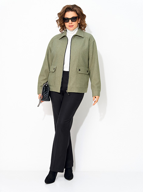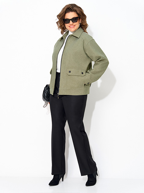 Эффектный стильный полушерстяной жакет, по типу бомбера, в стиле «old money», элегантность на каждый сезон (лето, весна, осень). Модель с центральной бортовой застежкой, на молнию. Воротник отложной. Рукав длинный, на спущенном плечевом поясе. Низ изделия и низ рукава оформлен притачным манжетам с застежкой на пуговицу. На полочке расположены рабочие накладные карманы с клапаном. По спинке предусмотрена кокетка с заложенными складками на свободу движения. Модель на шелковой подкладке. В комплекте классические женские брюки, со средней посадкой, прямого покроя от бедра. Застежка – брючная тесьма-молния с обработанным гульфиком. Карманы боковые. Пояс притачной, в боковых участках вставлена резинка на свободу. По переду заутюжены канты. Спинка с Талиевыми выточками. Подгибка брюк –– 4 см. Длина по спинке – 63-65 см, длина рукава-63 см. Длина брюк – 104 см