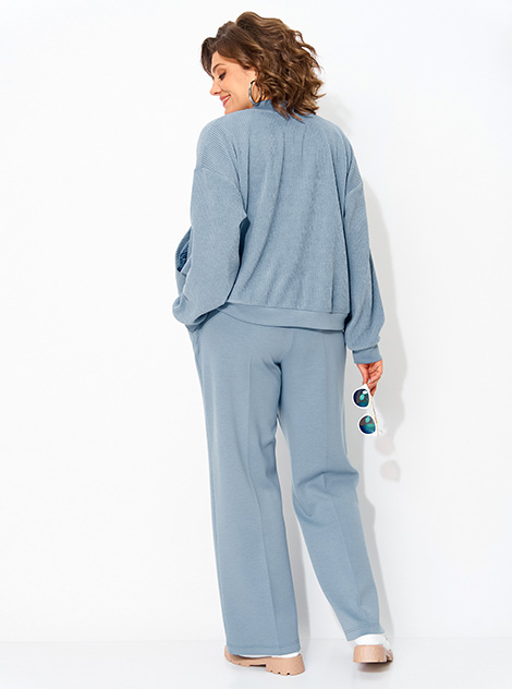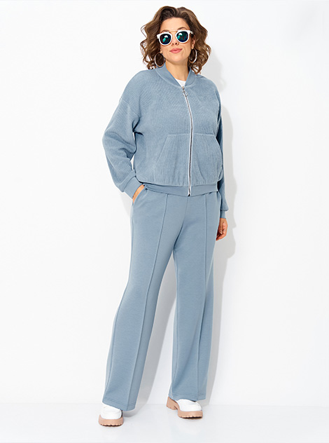 Эффектный и стильный прогулочный трикотажный костюм, состоящий из бомбера и брюк, который отлично подойдет в повседневной носке и загородного отдыха! Модель жакета-бомбера выполнена из трикотажного штрукса! Изделие свободного силуэта, с длинным рукавом на спущенном плечевом поясе. Застежка центральная на молнию. По низу рукава и низу изделия идет мягкая планка из отделочной ткани. Бомбер с накладными карманами по переду. В комплекте брюки, средней посадки, прямго покроя. Брюки с застроченными кантами по переду и боковыми карманами в швах. Пояс в брюках притачной на круговой резинке. Этот костюм отлично садится на большие размеры и плюс сайз, подчеркивая достоинства фигуры и скрывая лишнее. Длина бомбера – по спинке 65 см, рукав – 62 см. Брюки около 106-104 см