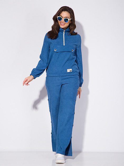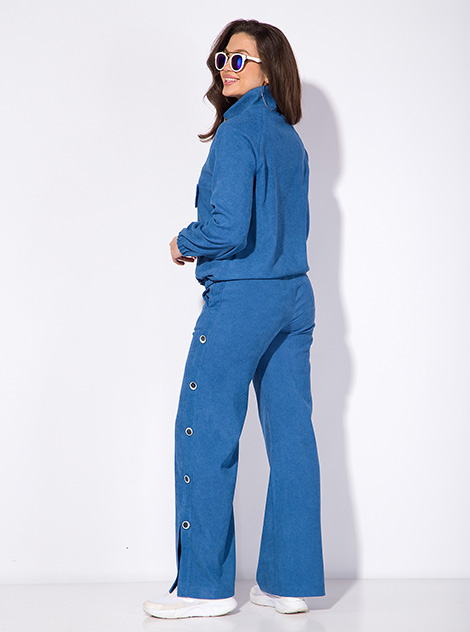 Оригинальный костюм 2-ка в стиле спорт-шик из вельвета - это идеальный и комфортный вариант для повседневной носки! Модель джемпера-анорак свободного силуэта с рукавом покроя реглан. По низу изделия и рукава предусмотрена мягкая резинка на сборку. Воротник - отложная стойка с металлической молнией по центру. По полочке расположен декоративный клапан. Брюки в костюме свободного кроя на притачном поясе с застежкой на молнию. По бокам расположены лампасы с рядом декоративных пуговиц. В брюках предусмотрены боковые карманы. По низу - оригинальные разрезы-шлицы на свободу движения. Невероятно мягкая и нежная ткань в дополнении с яркой фурнитурой придаст Вам индивидуальности и изыска. Джемпер – 60 см, рукав – 63 см. Брюки – 106 см