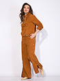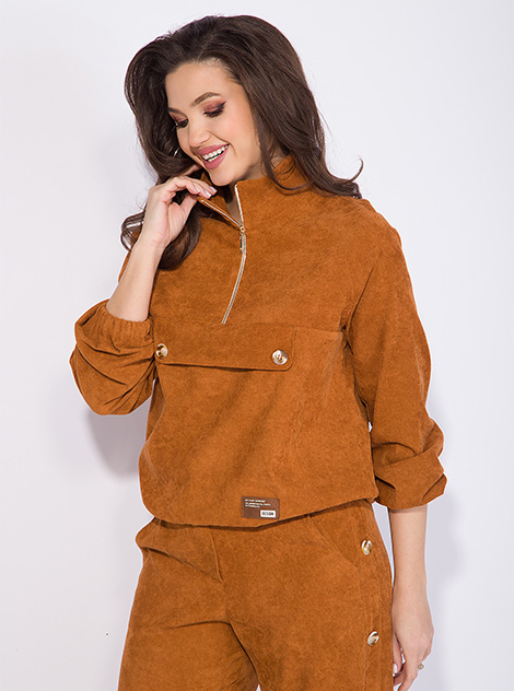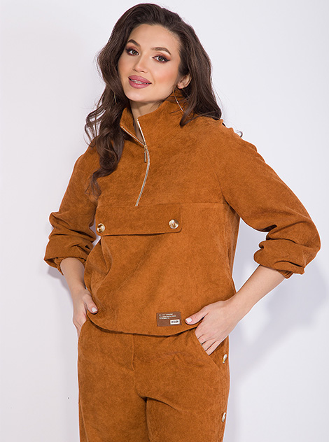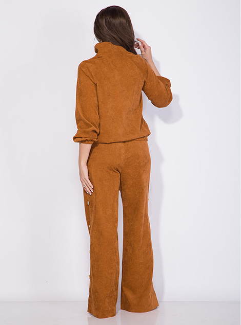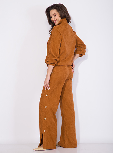 Оригинальный костюм 2-ка в стиле спорт-шик из вельвета - это идеальный и комфортный вариант для повседневной носки! Модель джемпера-анорак свободного силуэта с рукавом покроя реглан. По низу изделия и рукава предусмотрена мягкая резинка на сборку. Воротник - отложная стойка с металлической молнией по центру. По полочке расположен декоративный клапан. Брюки в костюме свободного кроя на притачном поясе с застежкой на молнию. По бокам расположены лампасы с рядом декоративных пуговиц. В брюках предусмотрены боковые карманы. По низу - оригинальные разрезы-шлицы на свободу движения. Невероятно мягкая и нежная ткань в дополнении с яркой фурнитурой придаст Вам индивидуальности и изыска. Джемпер – 60 см, рукав – 63 см. Брюки – 106 см