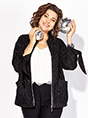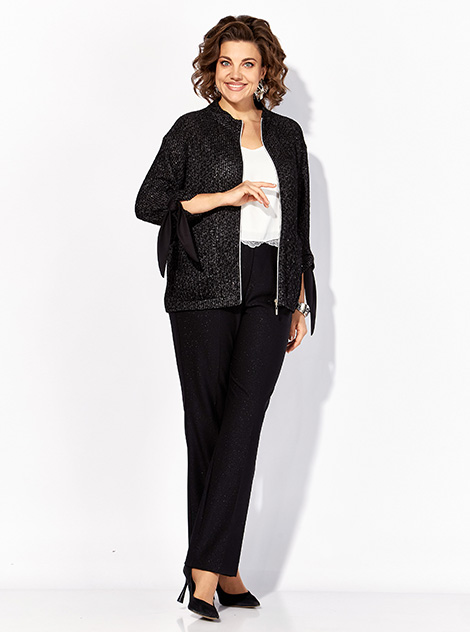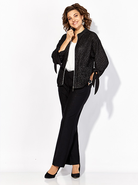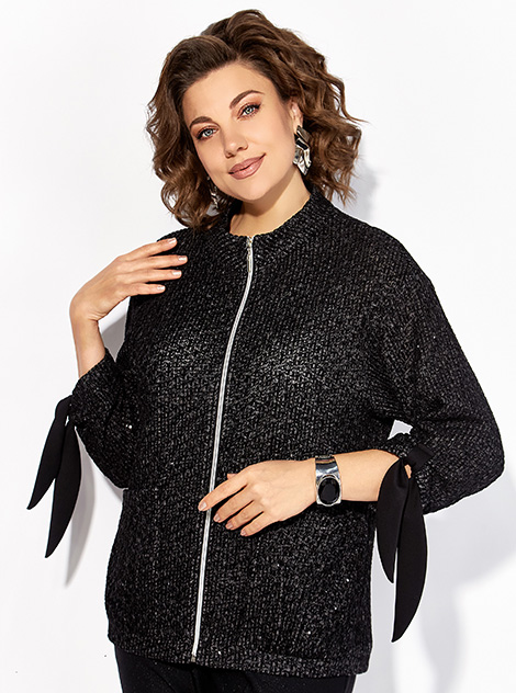 Эффектный, нарядный облегченный жакет, выполнен из вязанного трикотажа с эффектом легкого мерцания. Модель свободного силуэта, с рукавом длиной ¾-ти на спущенном плечевом поясе. Горловина обработана полулежащей стойкой. Застежка центральная на молнию. По полочке расположены аккуратные накладные карманы. Низ изделия оформлен притачной планкой. Изюминкой данной моделям служит необычные паты по рукаву с завязкой в виде банта. Этот вязанный трикотажный жакет - идеальный вариант для создания стильного и привлекательного романтического образа! Мягкий и нежный материал делает его очень приятным на ощупь, теплым и уютным, а легкое мерцание придает свою изюминку. Отлично сочетается с классическими прямыми брюками из базовой коллекции от бренда Лилиана! Длина – по спинке – около 70 см см, рукав – 55 см